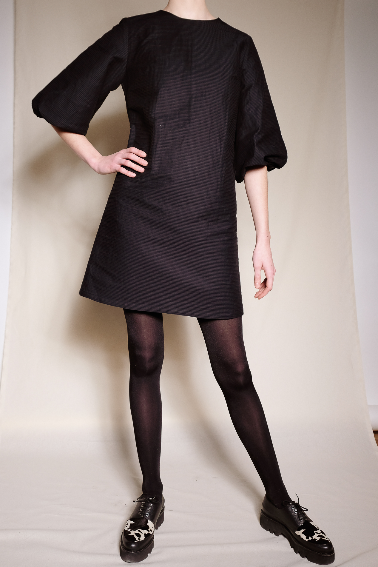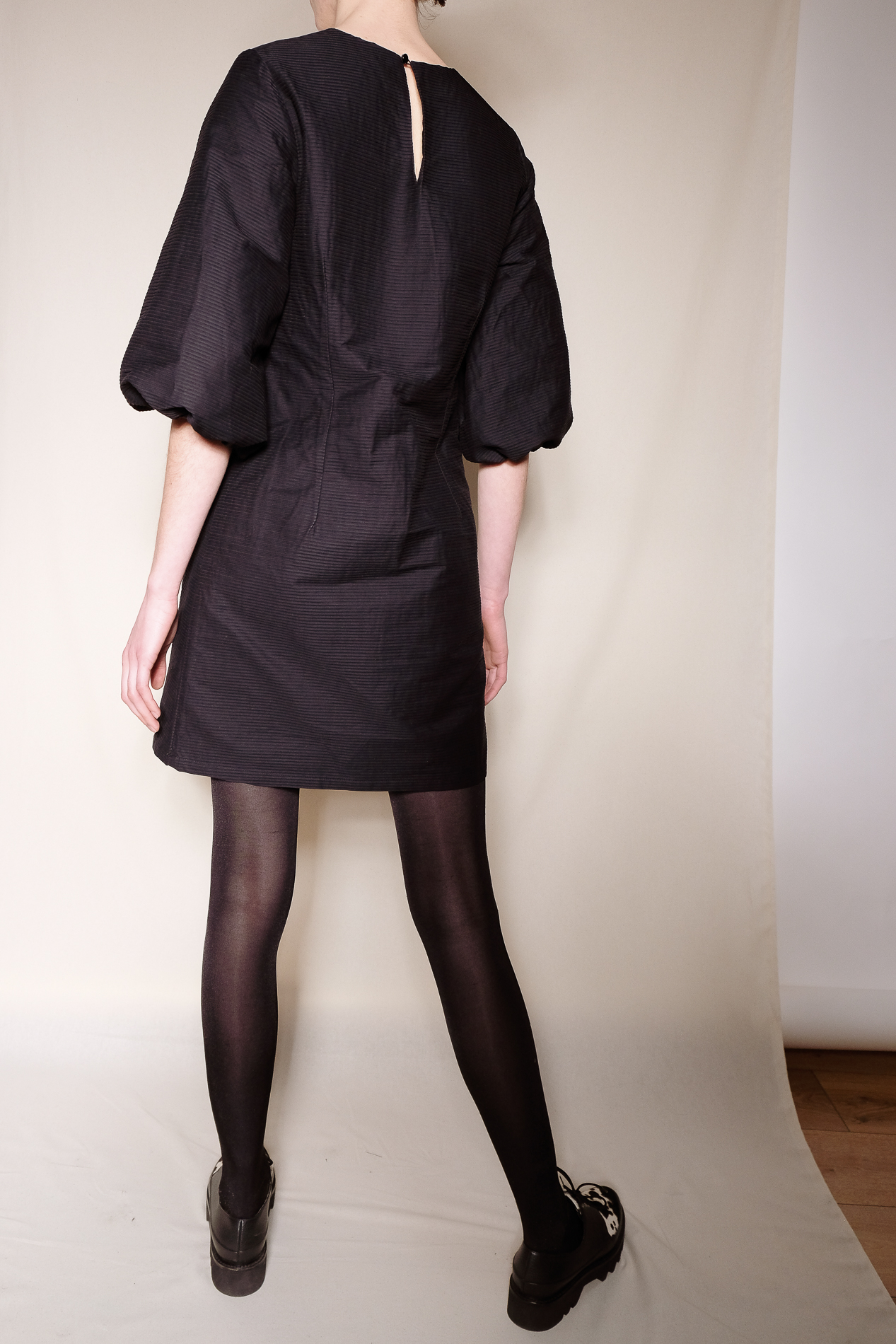La petite robe noire à la fois classique et moderne. Classique par sa coupe trapèze légèrement cintrée par 2 pinces dos. Et modernes par la forme de ses manches, travaillées en volume autour du coude. Le tissu est fait de petits plis horizontaux qui lui donnent de la tenue.