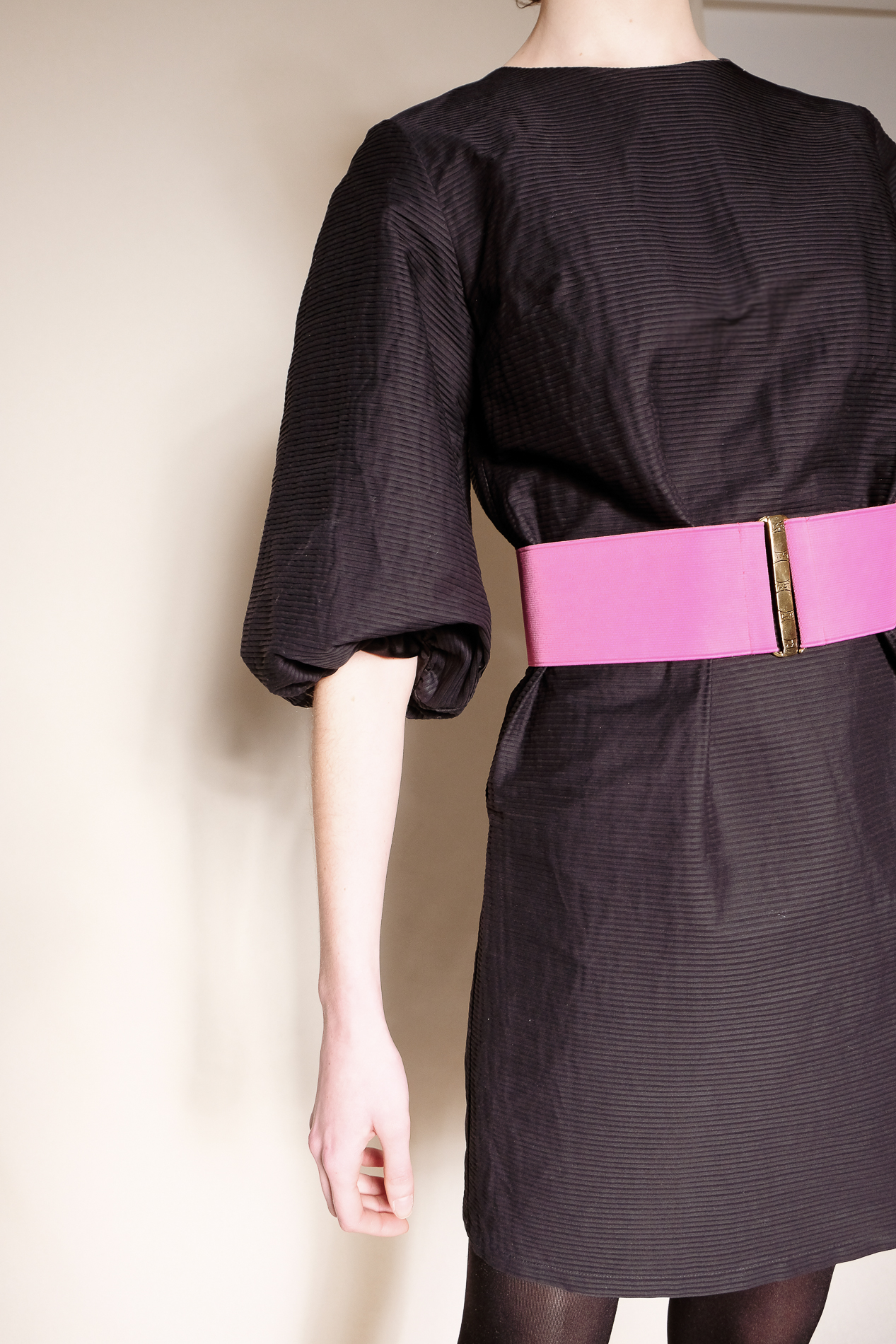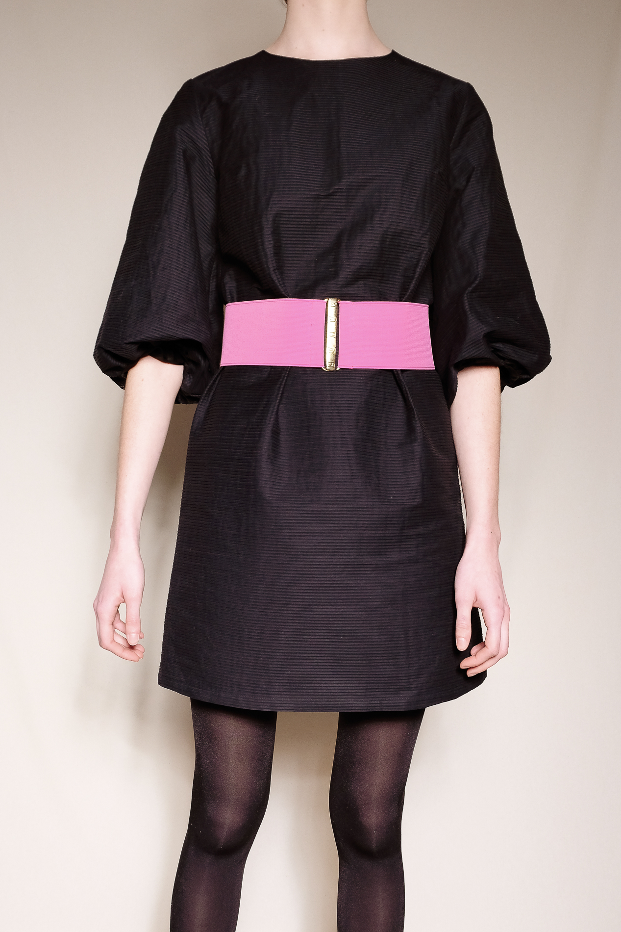 La robe se porte aussi avec la ceinture rose fushia à boucle pour un look années 80.